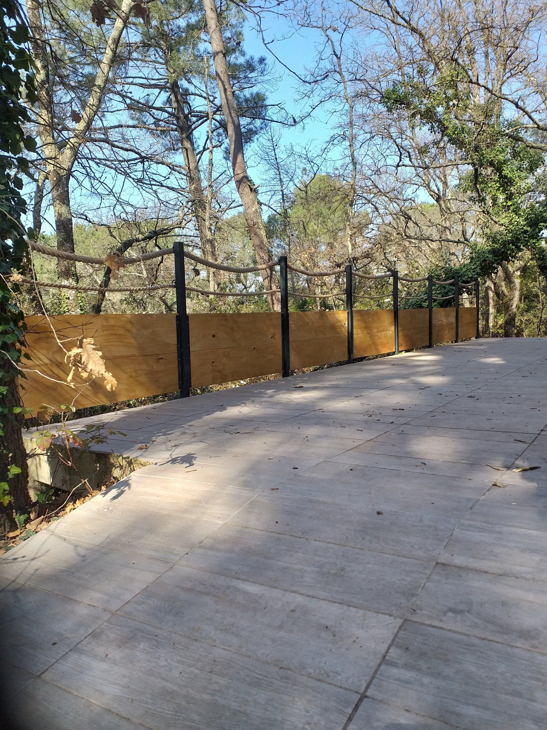 Fabrication et installation garde-corps acier et bois en pin Sylvestre, lisse et sous lisse en corde diamètre 40 et 20