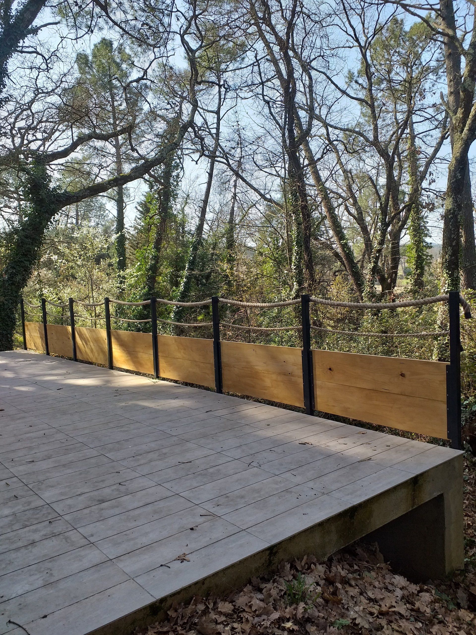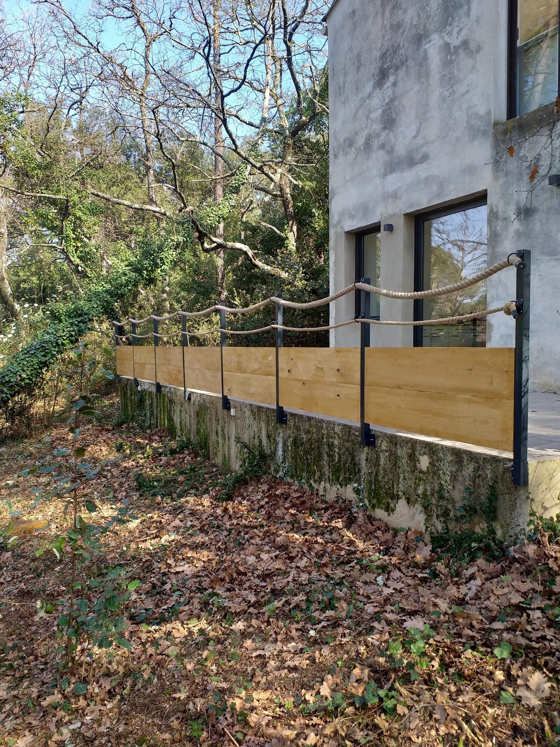 Fabrication et installation garde-corps acier et bois en pin Sylvestre, lisse et sous lisse en corde diamètre 40 et 20