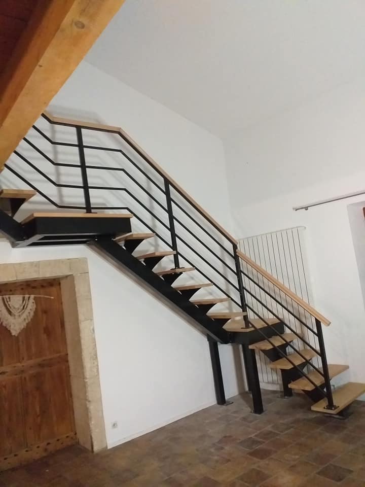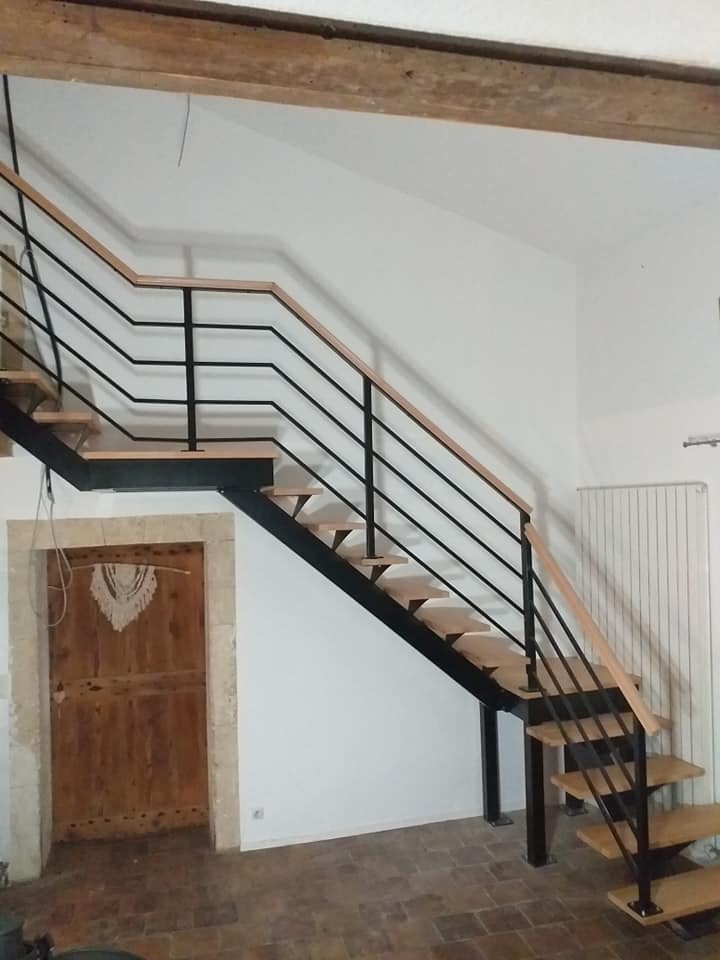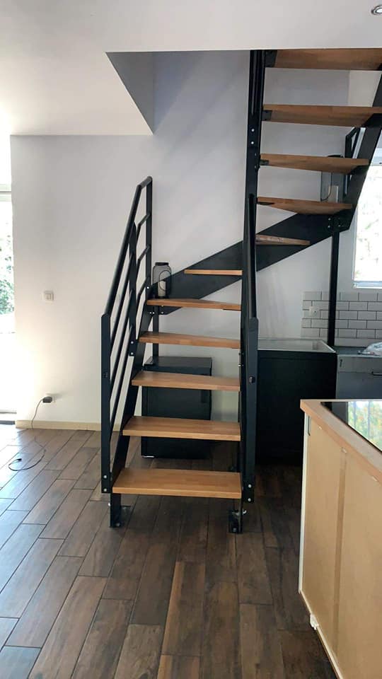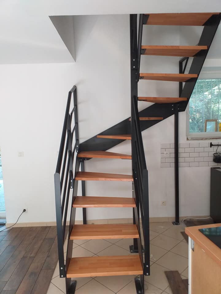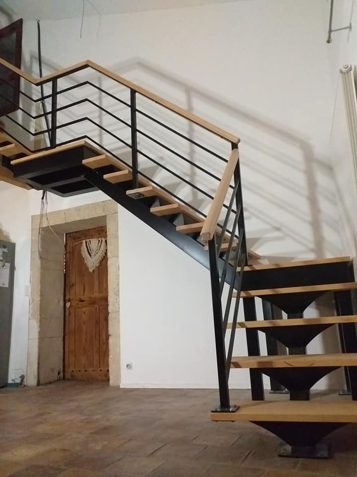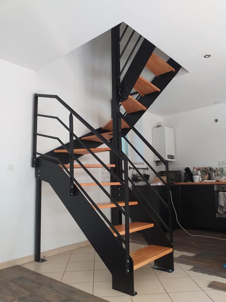 Conception et installation escalier quart tournant acier et bois double pallier.
