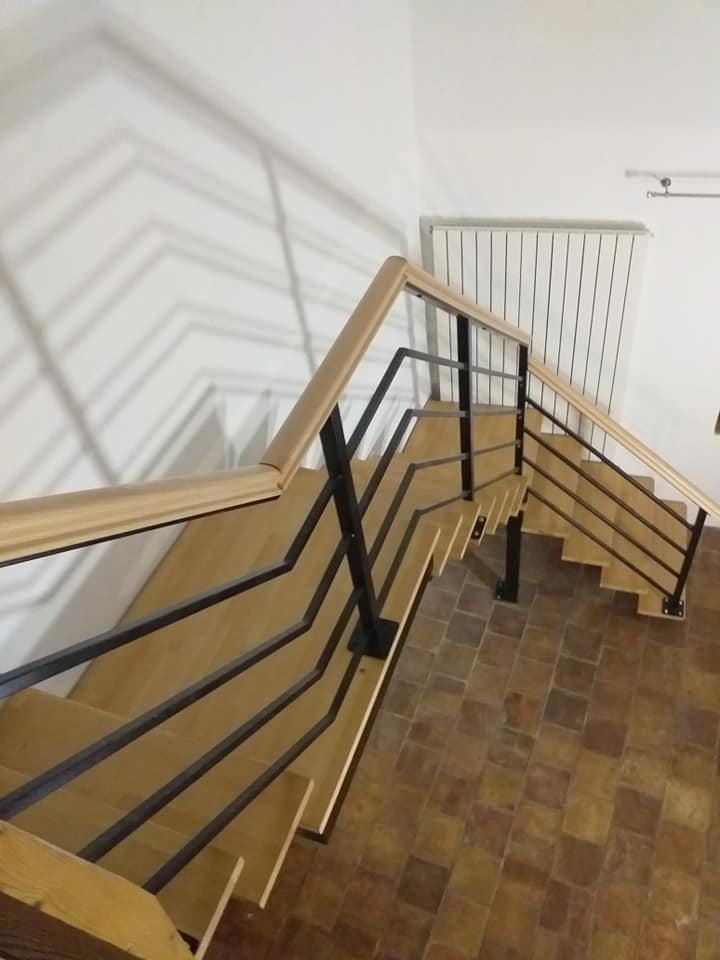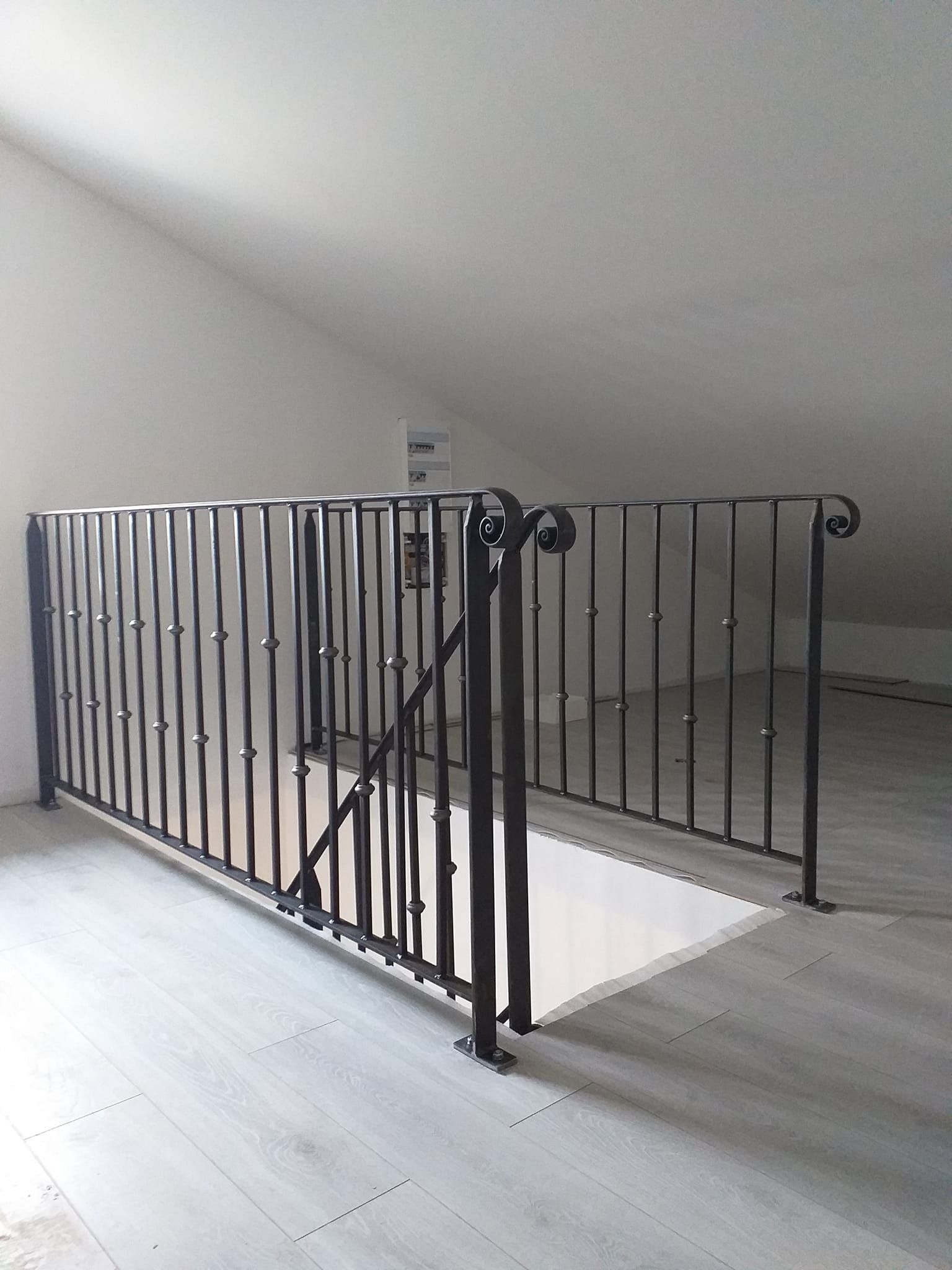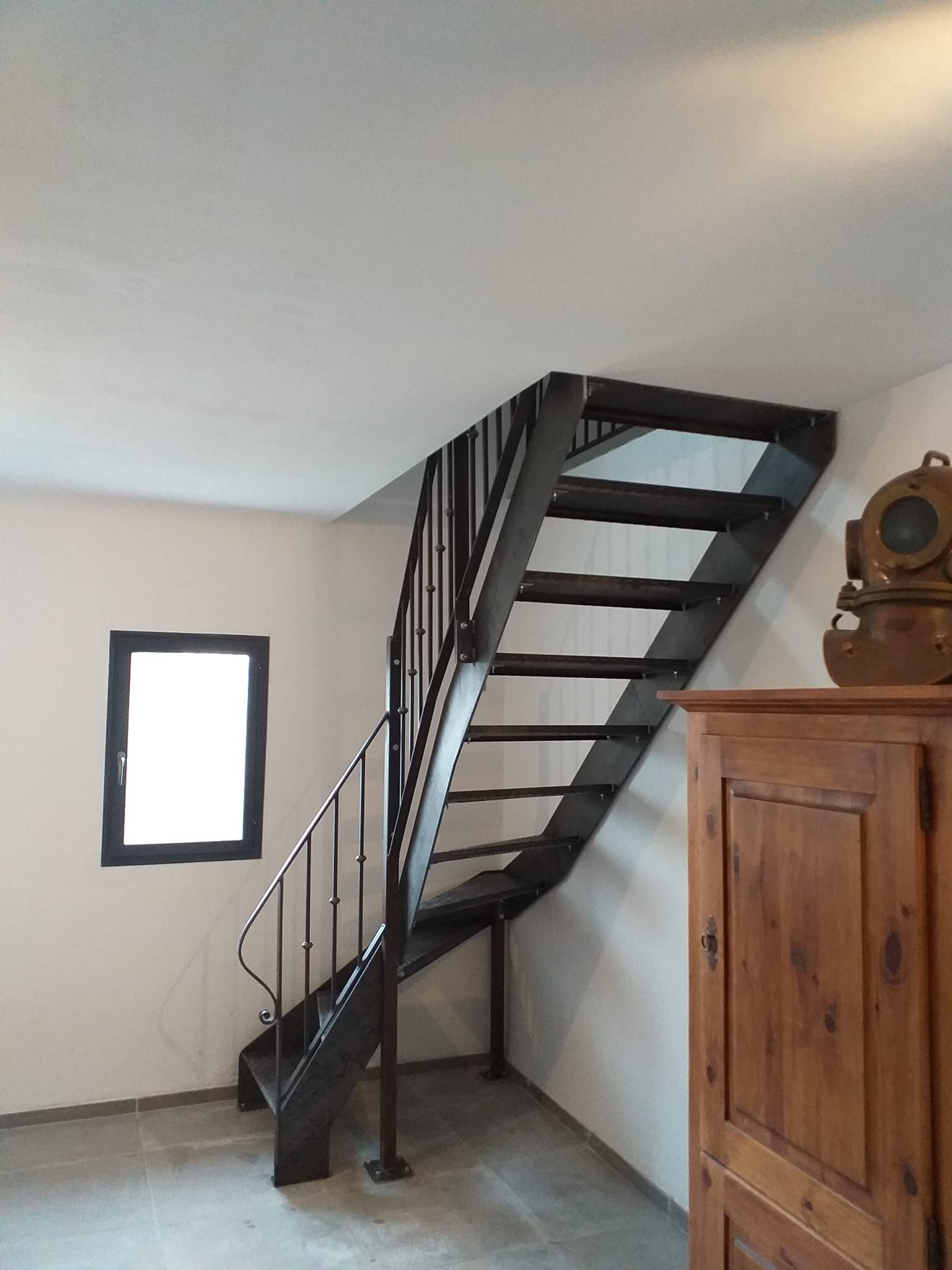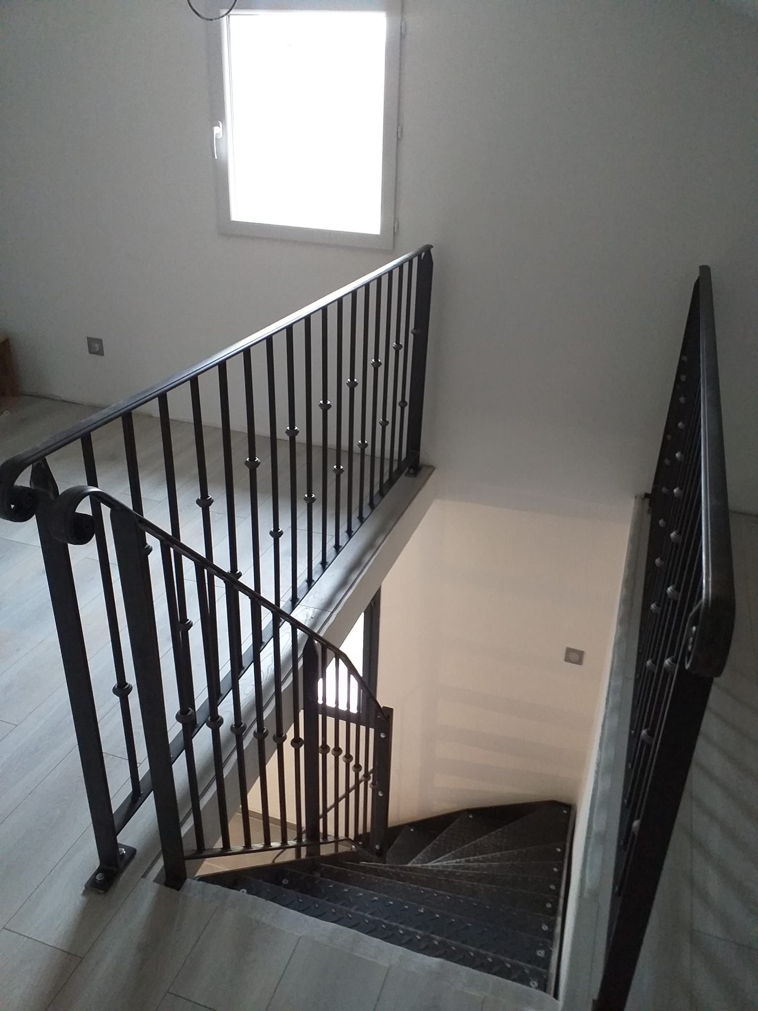 Conception et installation escalier quart tournant balancé et garde-corps en fer forgé traditionnel finition brut vernis