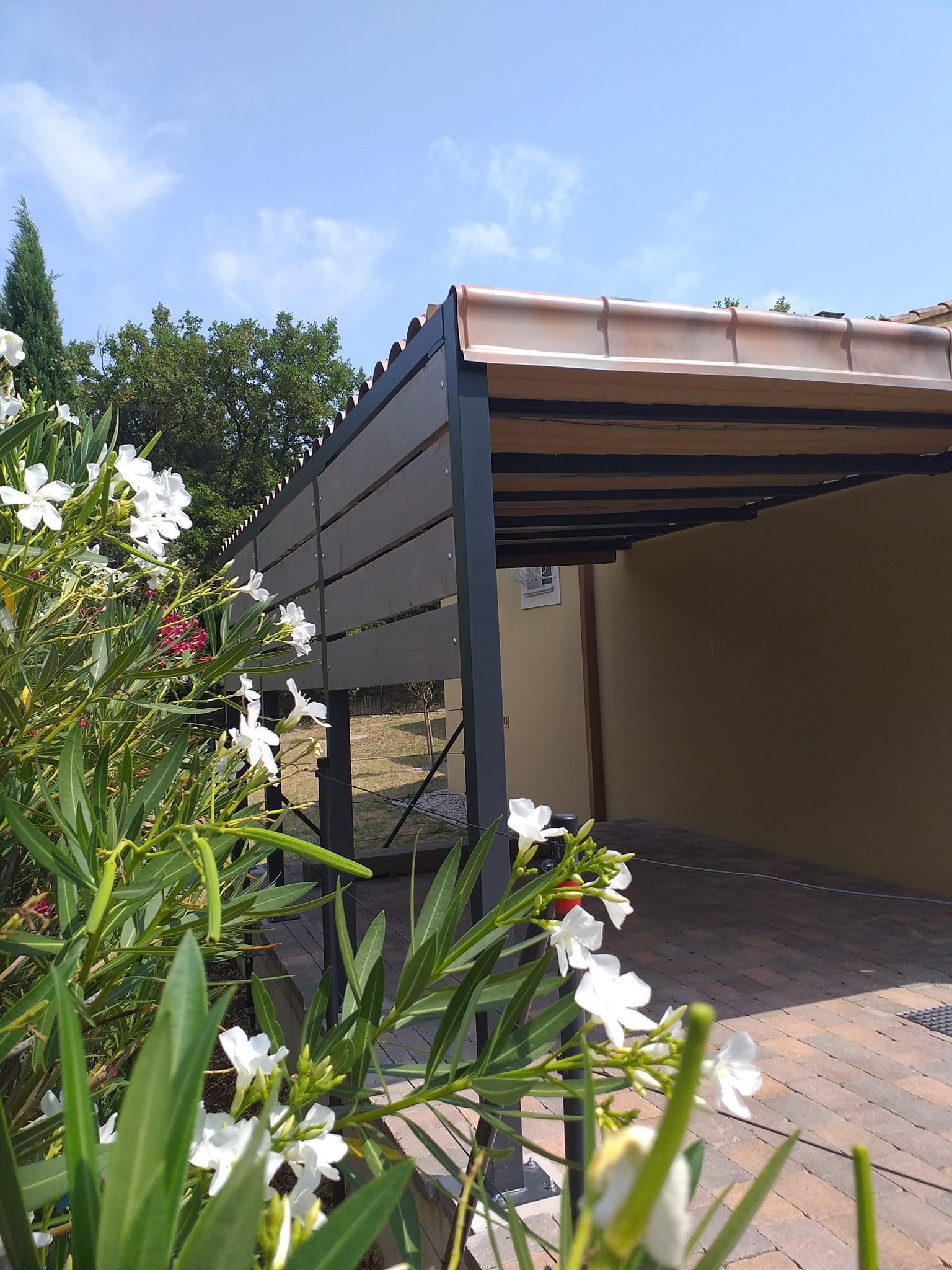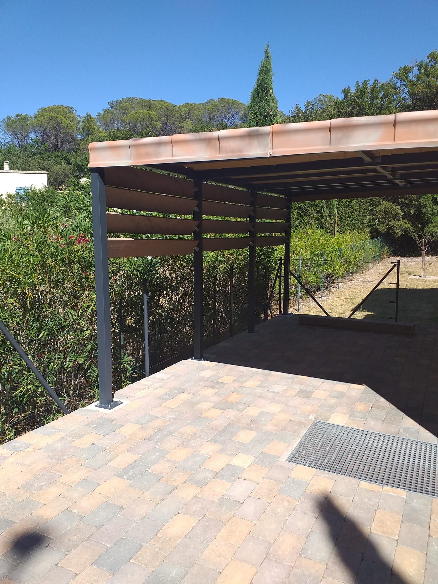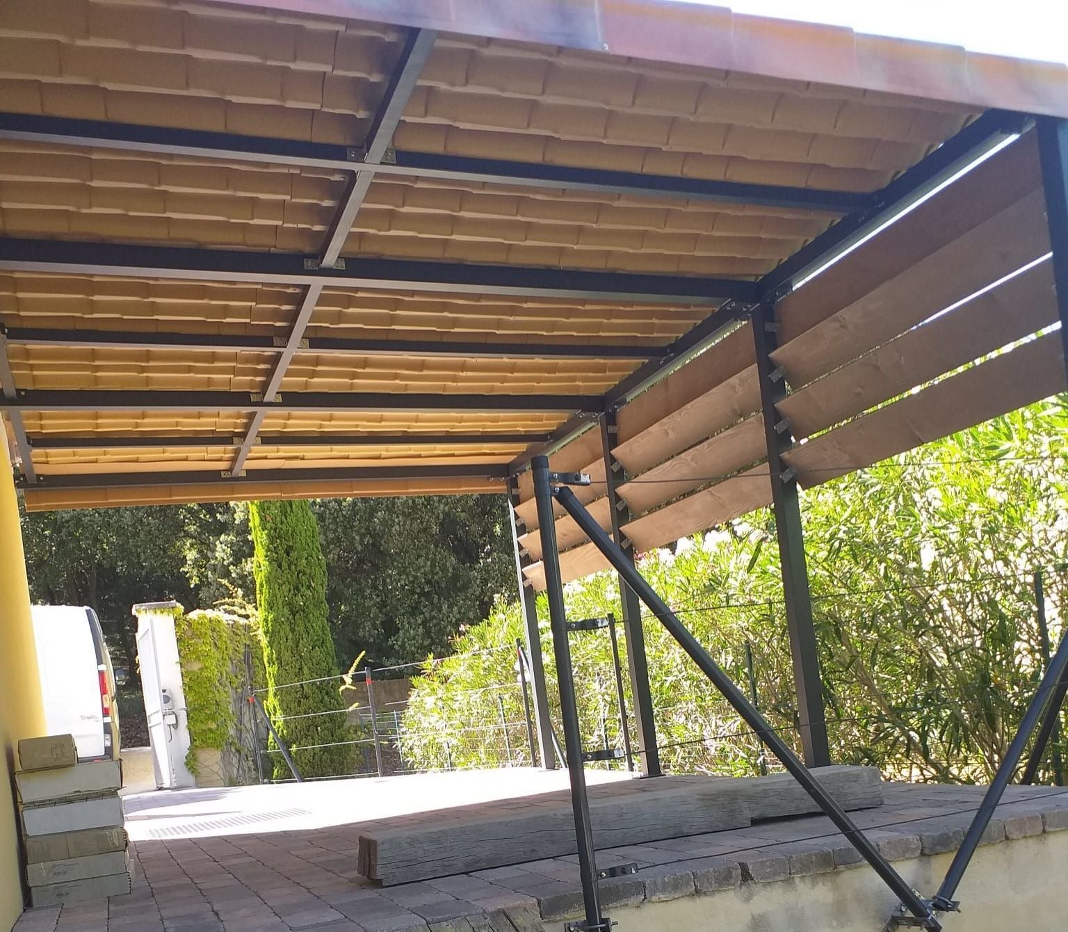 Conception et installation abri voiture, ossature acier, habillage pin Sylvestre et couverture pvc