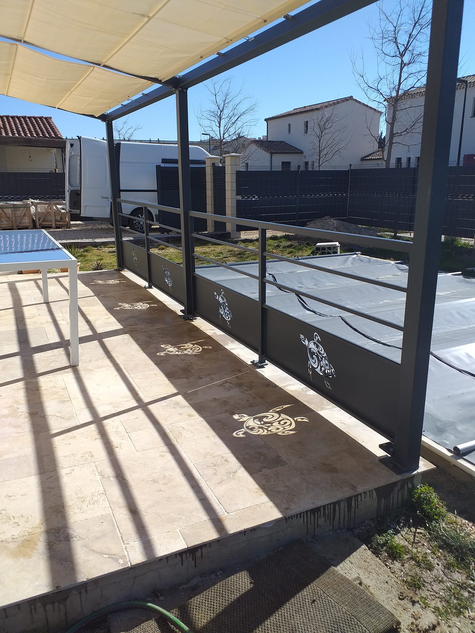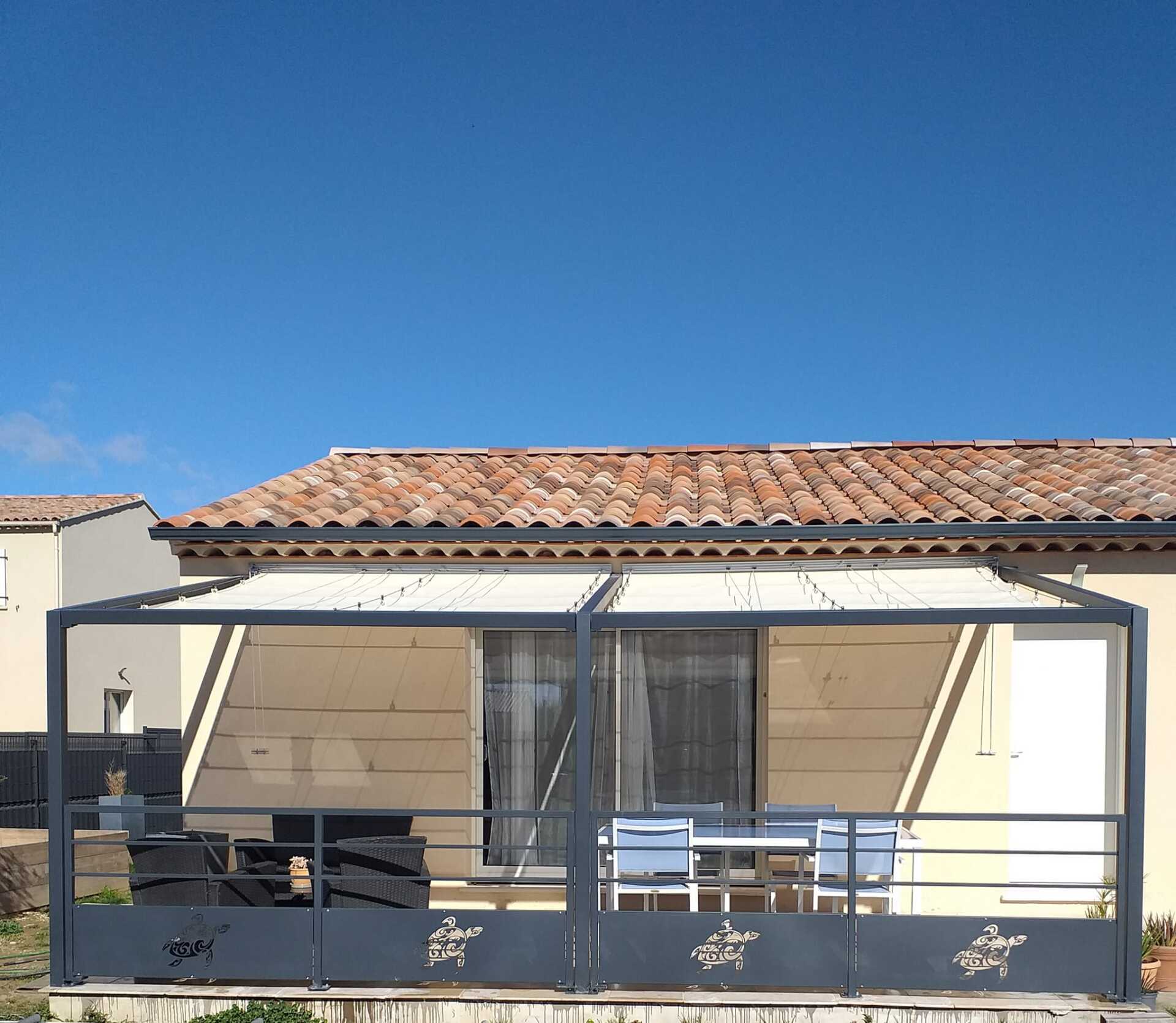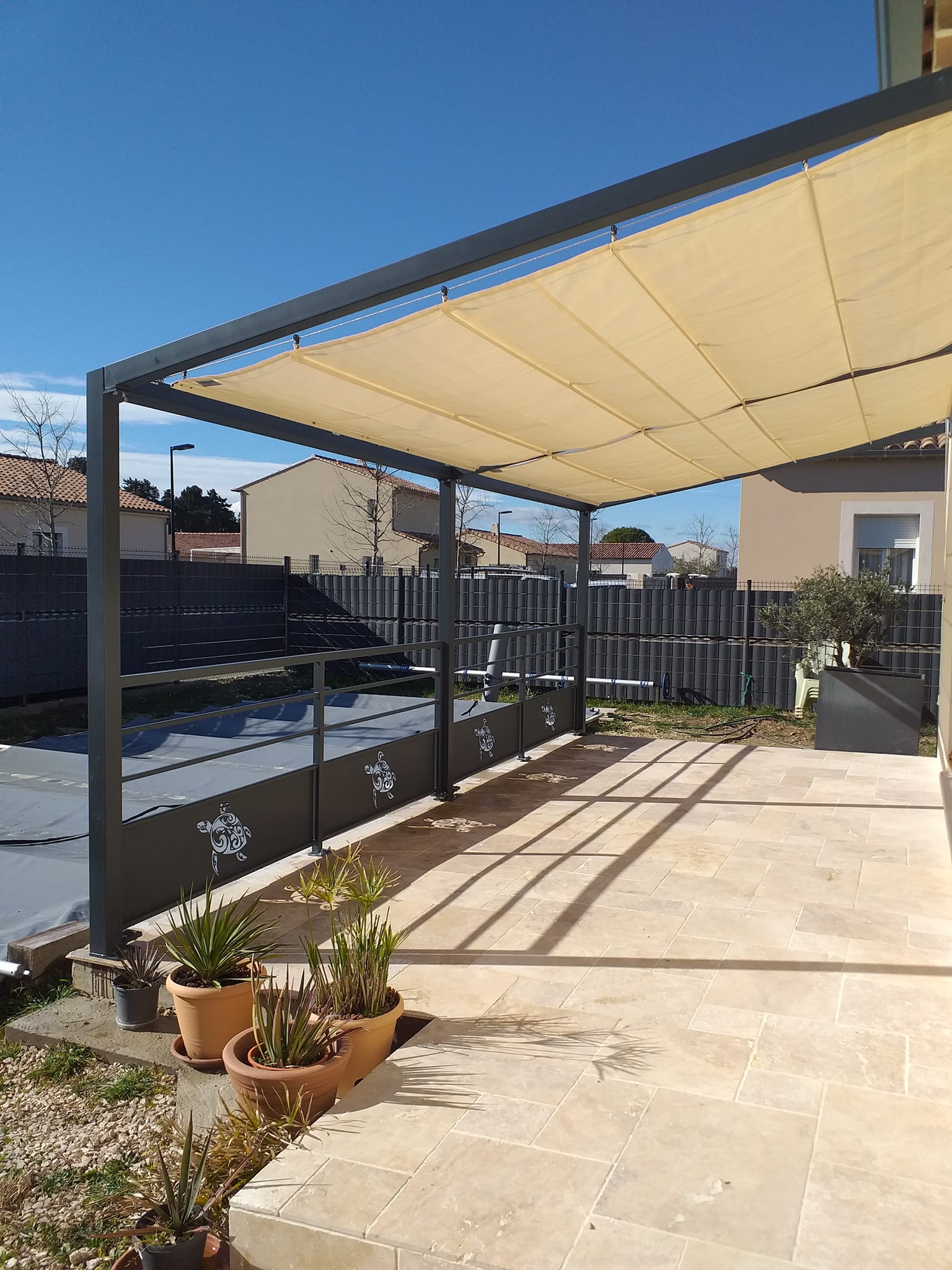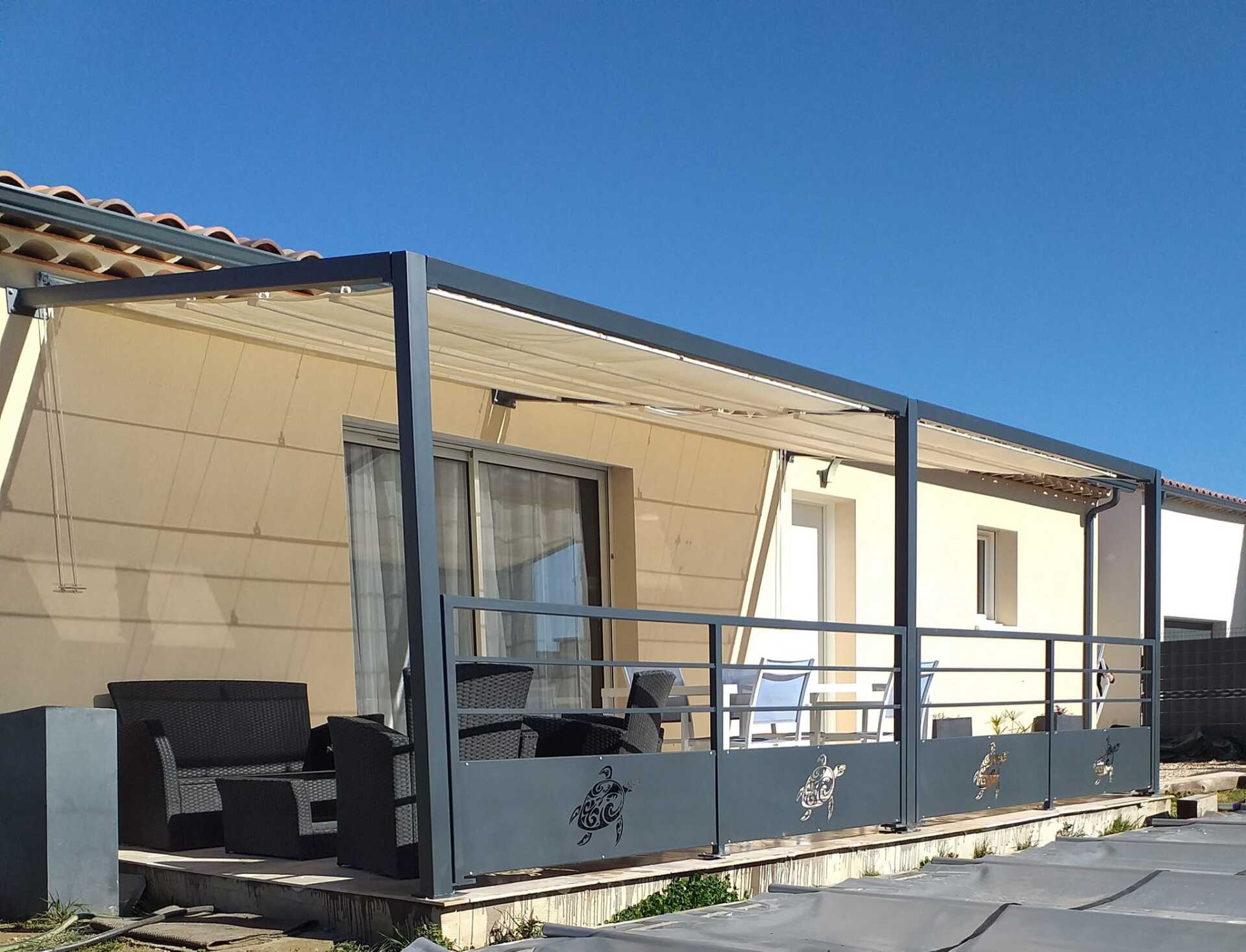 Conception et installation pergola avec toile coulissante sur câbles et garde-corps motifs tortue polynésienne